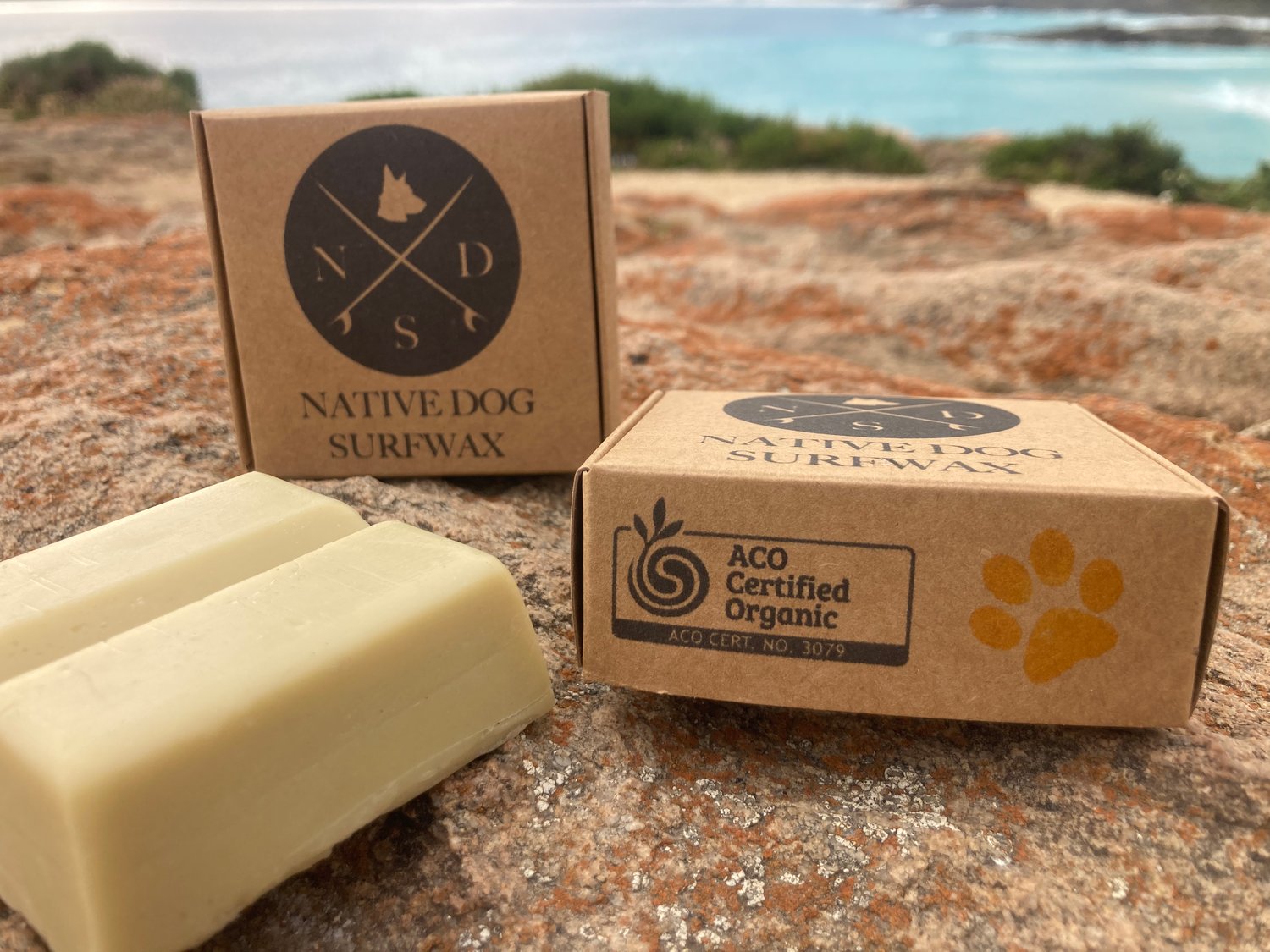 Get your paws on some of our awesome eco friendly all natural surf wax. Now using certified organic beeswax! No petroleum based wax here! A bigger block than most brands, this blend works best in Tropical Water (20-28 C) or as a base coat. approx 100 grams of grip.